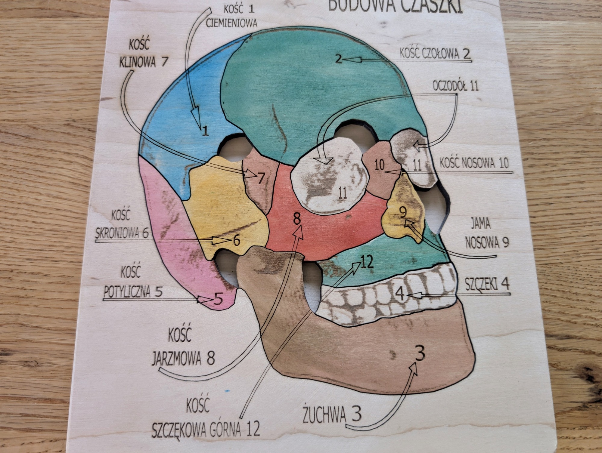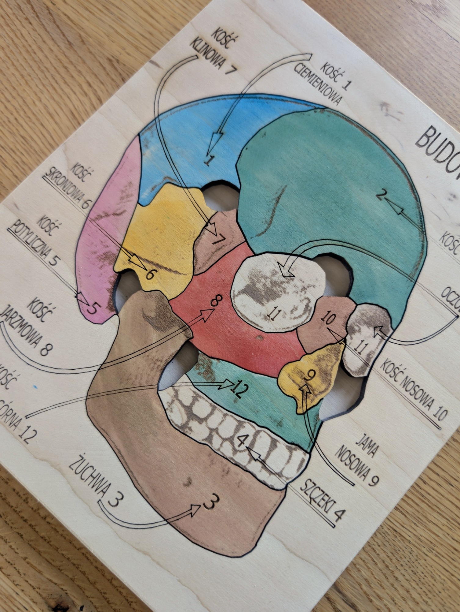Budowa czaszki – anatomia człowieka, to pomoc dydaktyczna, wykonana z drewna brzozowego, całość pomalowana jest bejcami wodnymi oraz, zabezpieczona jest lakierem.