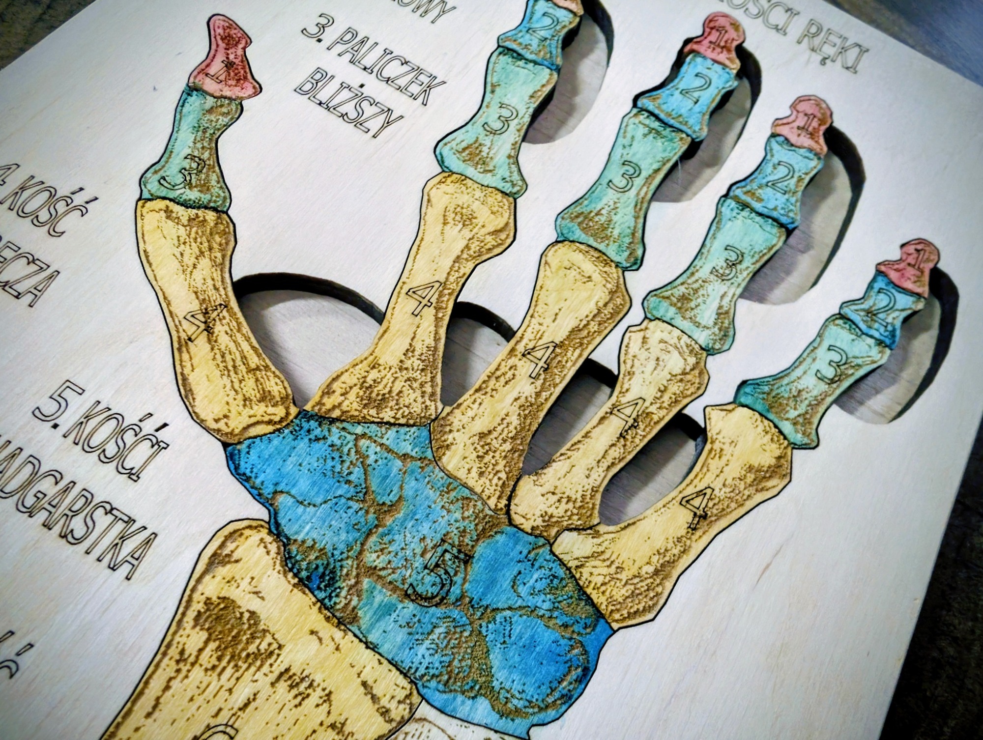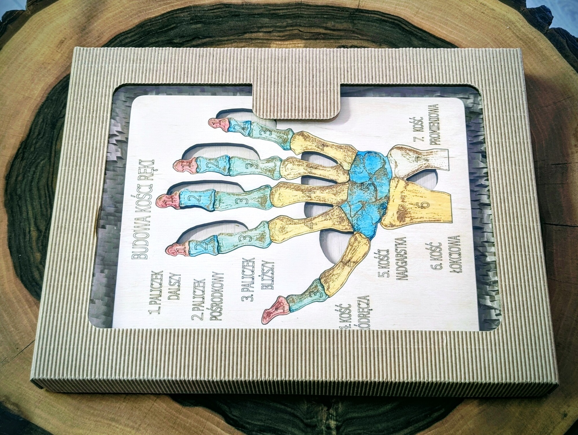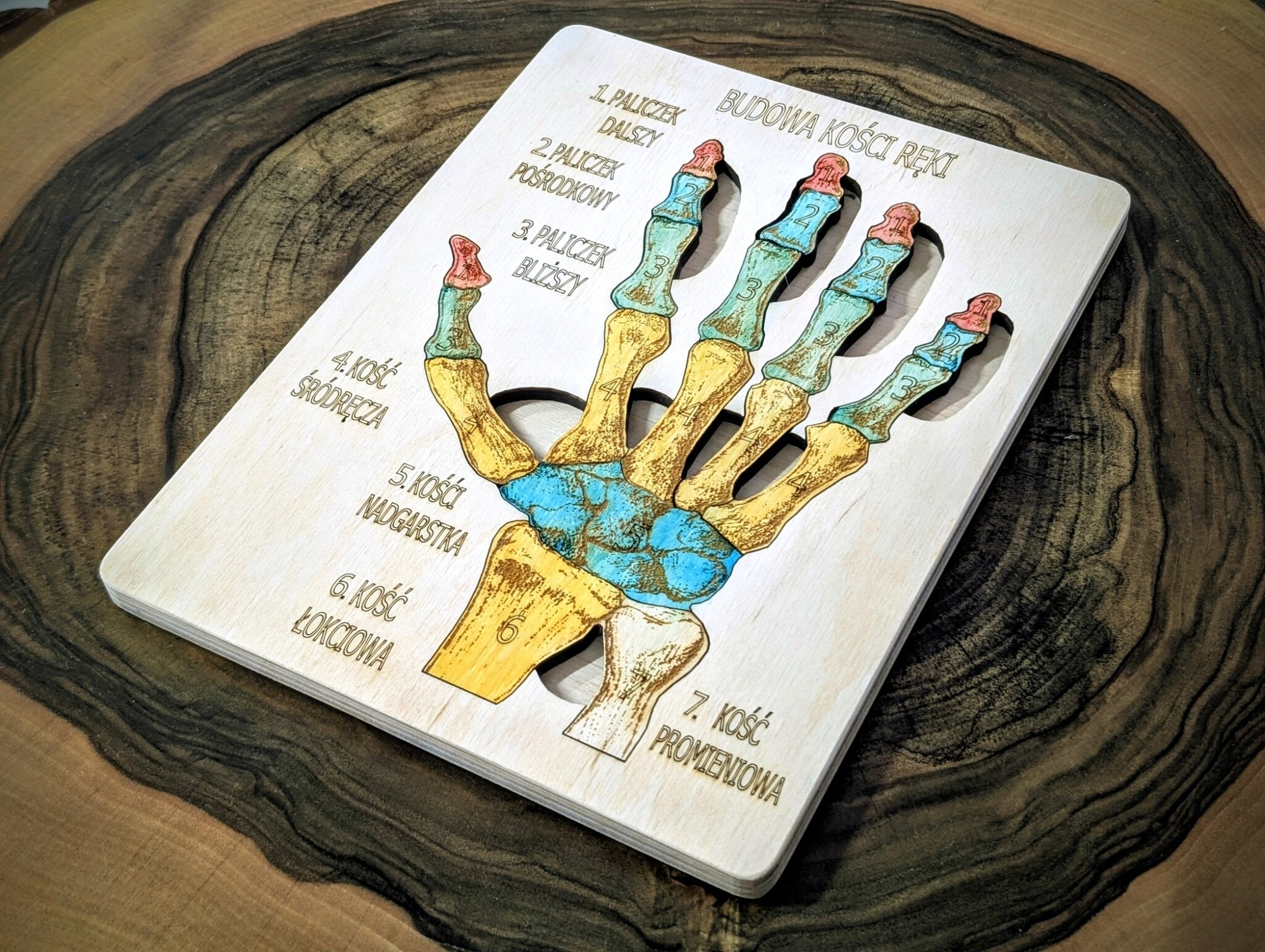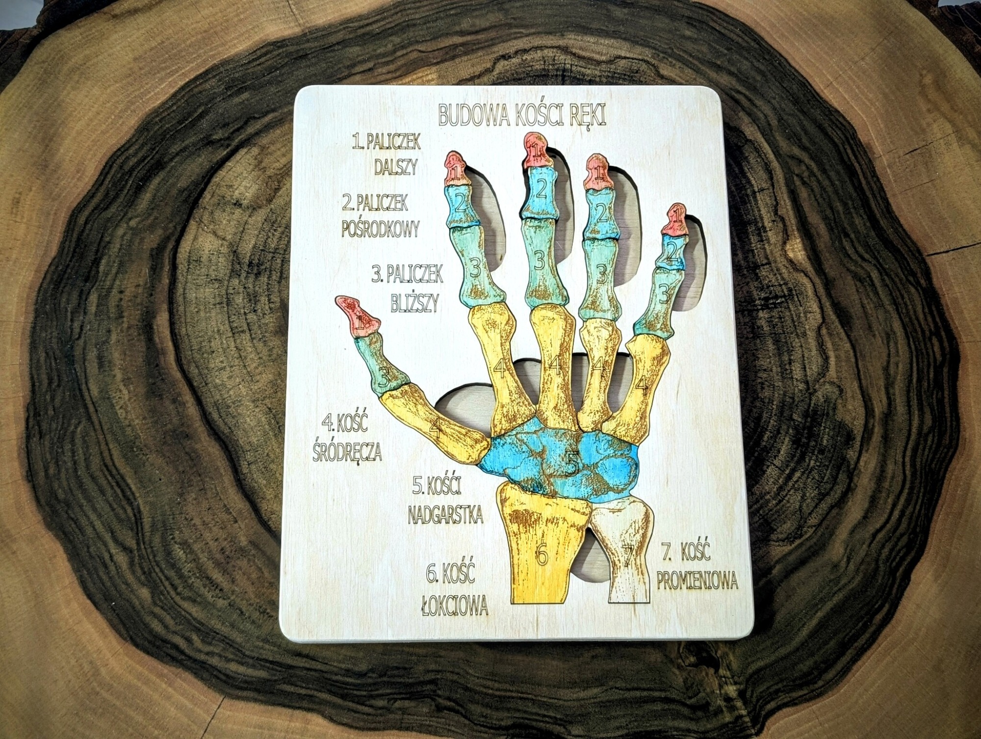 Budowa kości ręki – anatomia człowieka, to pomoc dydaktyczna, wykonana z drewna brzozowego, całość pomalowana jest bejcami wodnymi oraz, zabezpieczona jest lakierem.