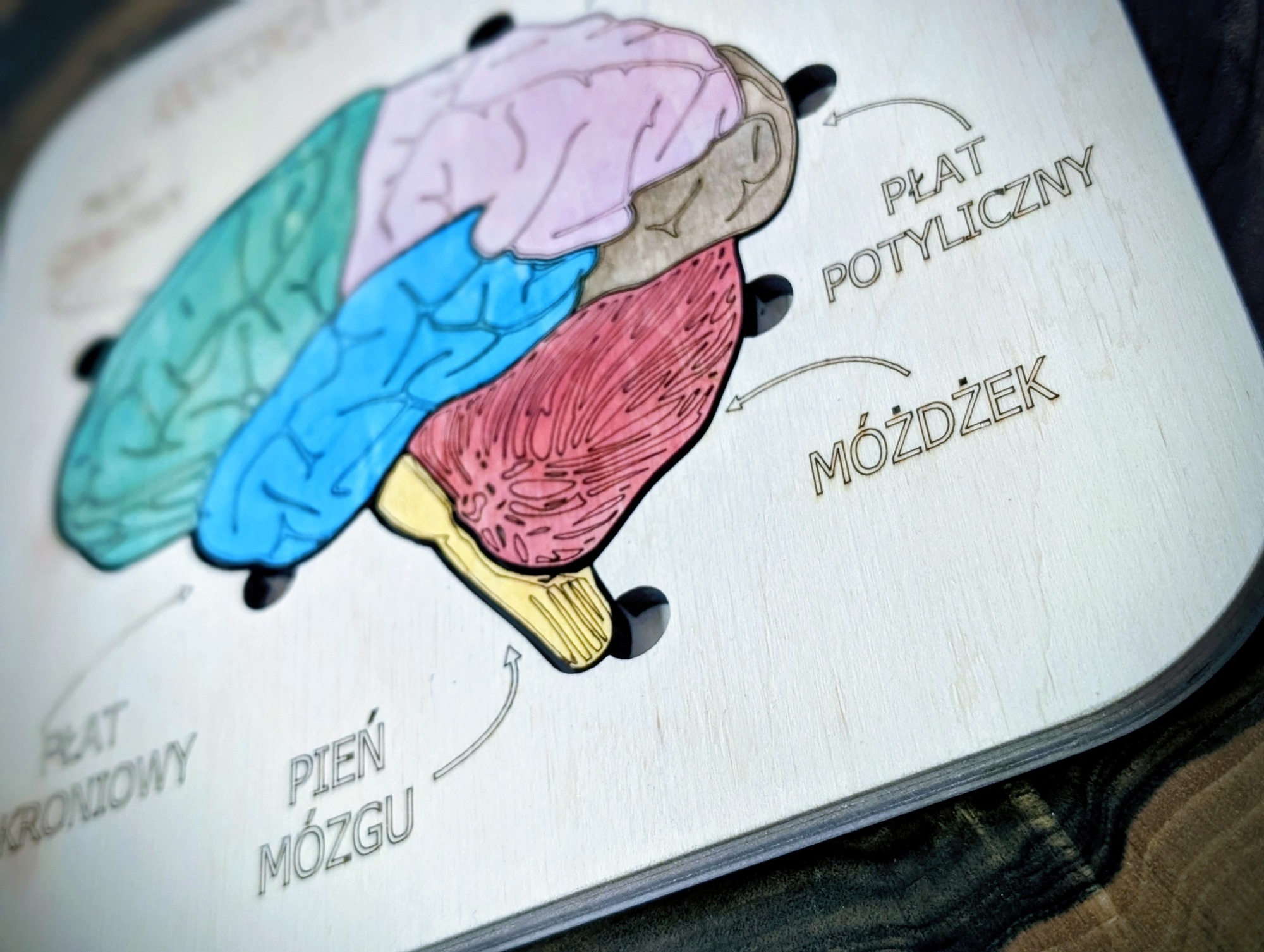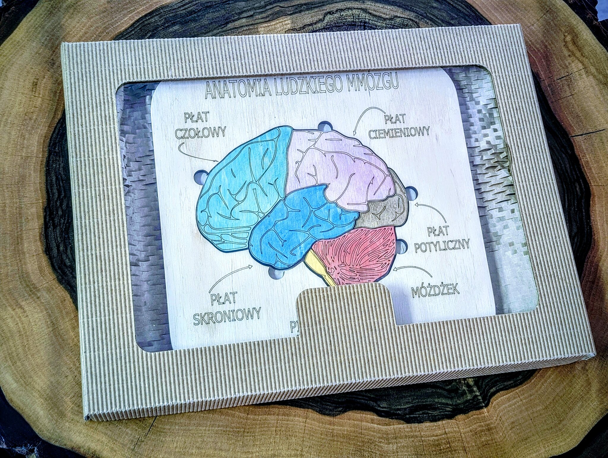 Budowa mózgu – anatomia człowieka, to pomoc dydaktyczna, wykonana z drewna brzozowego, całość pomalowana jest bejcami wodnymi oraz,  zabezpieczona jest lakierem.