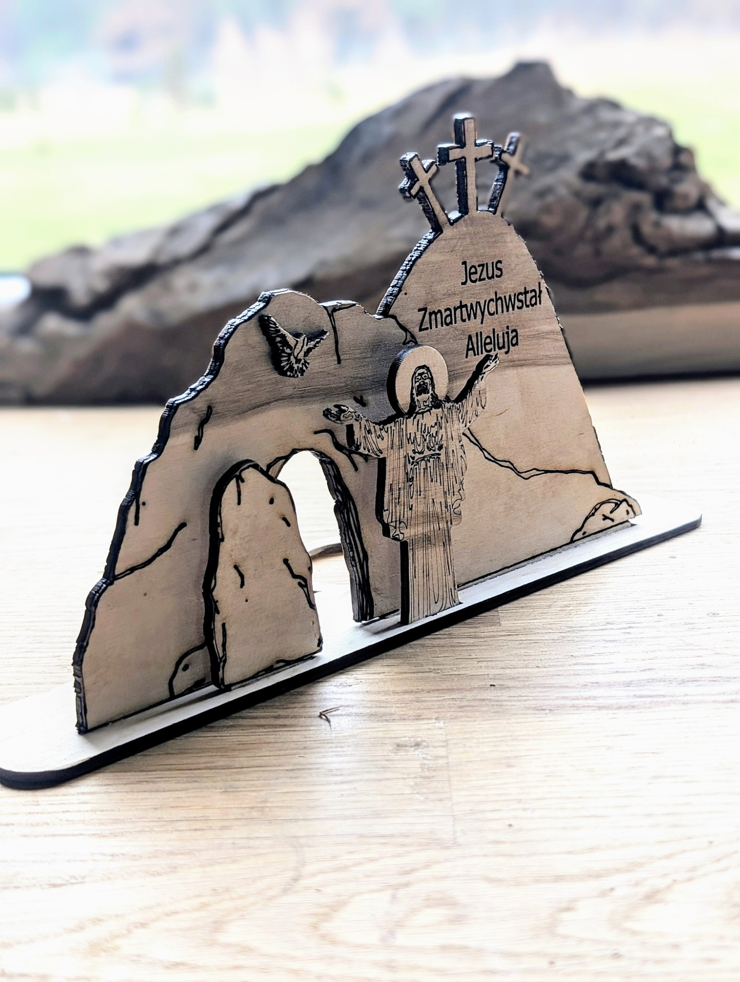 Dekoracja Wielkanocna przedstawiająca pusty grób, Zmartwychwstanie Jezusa.