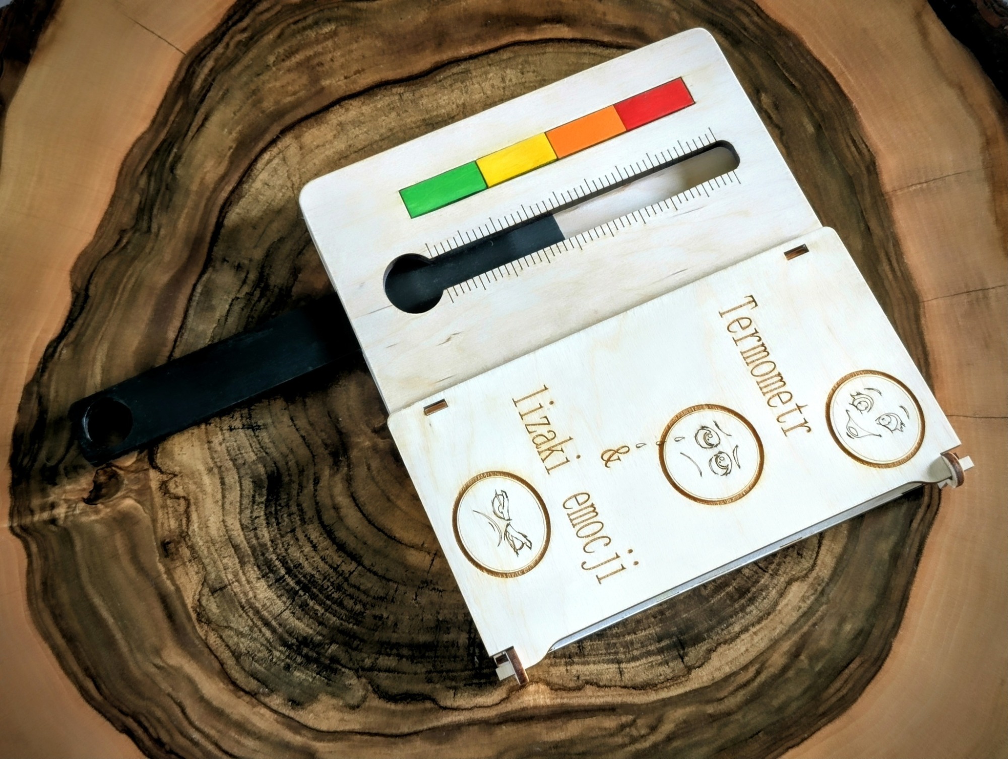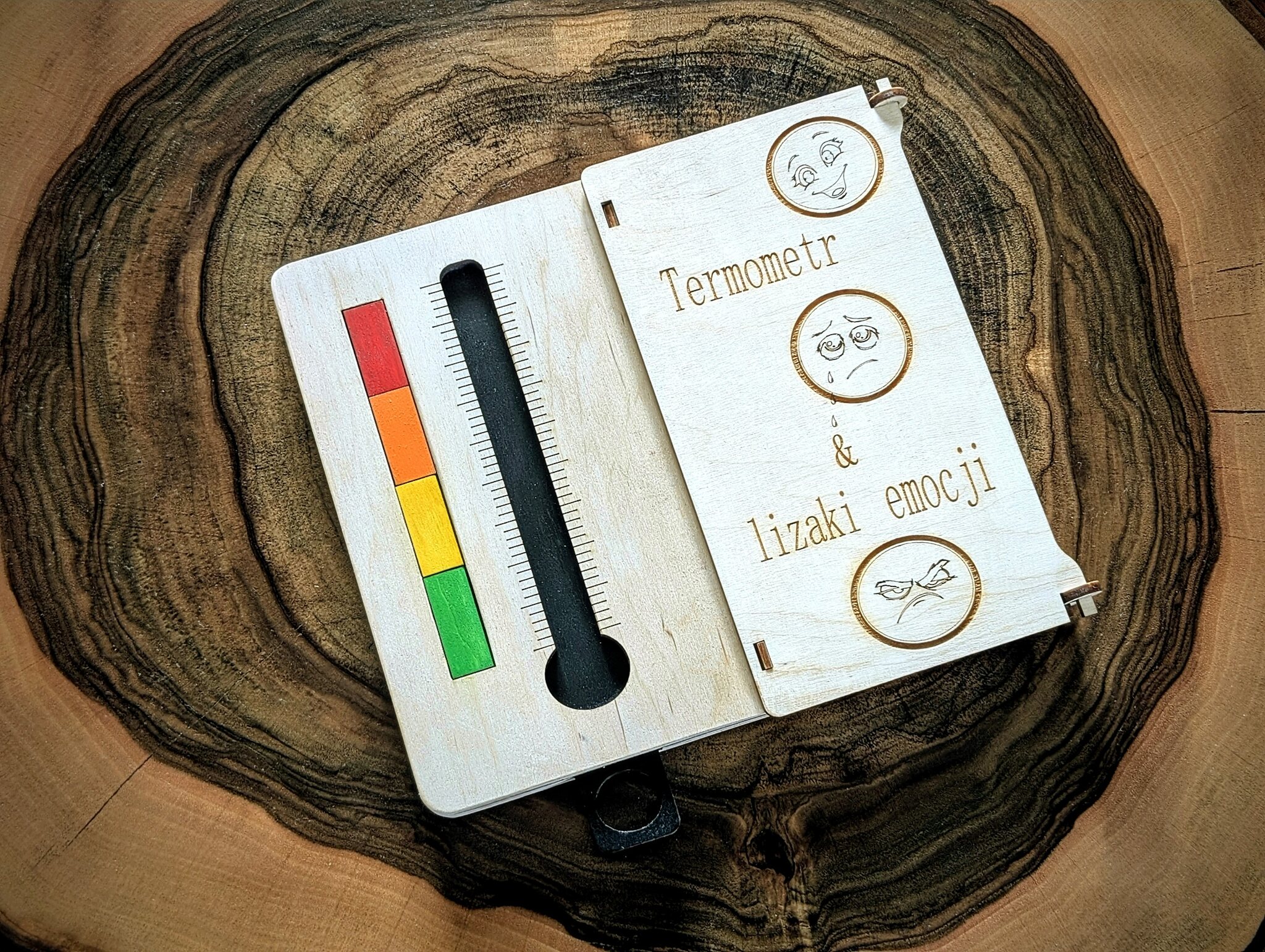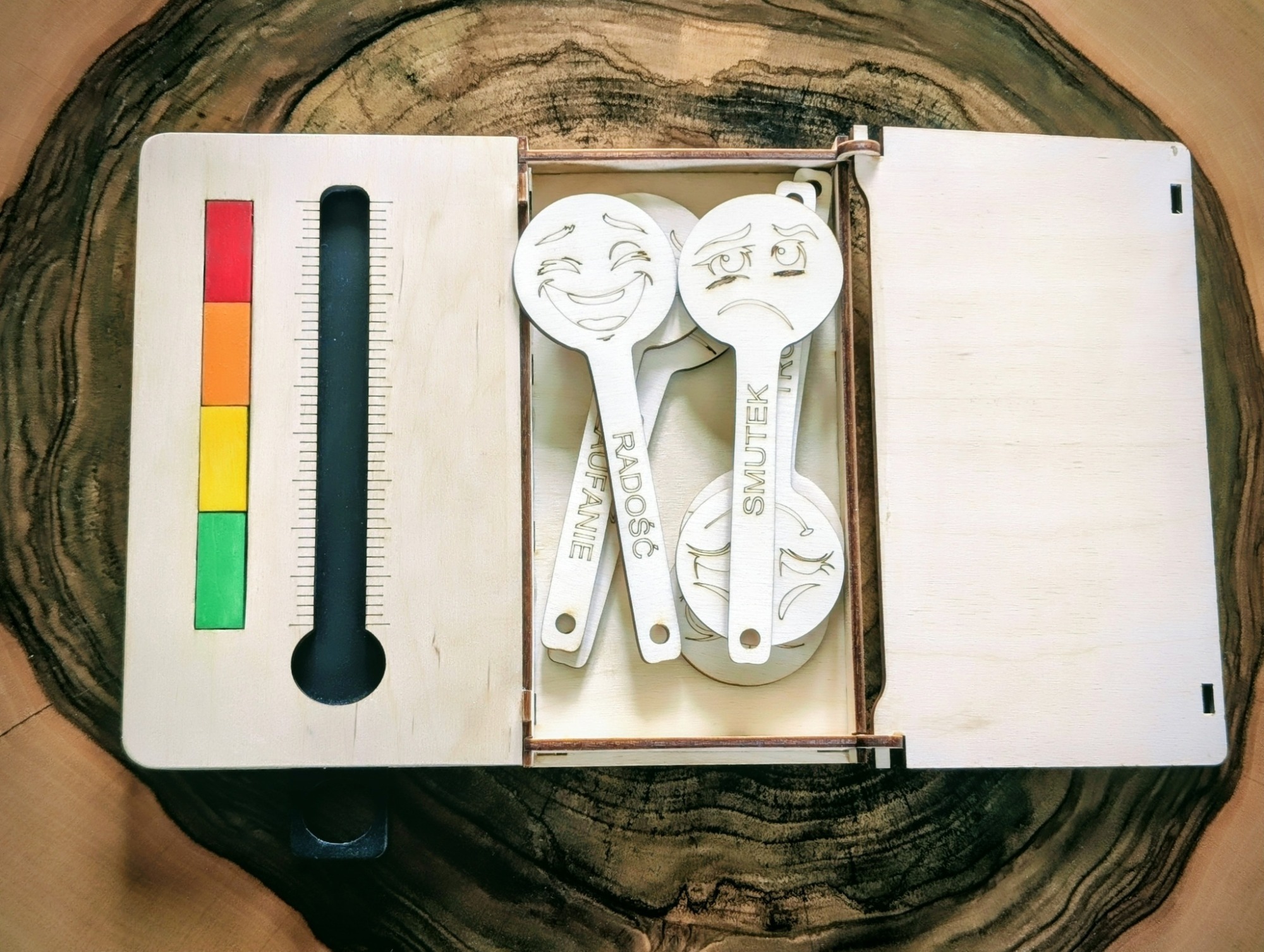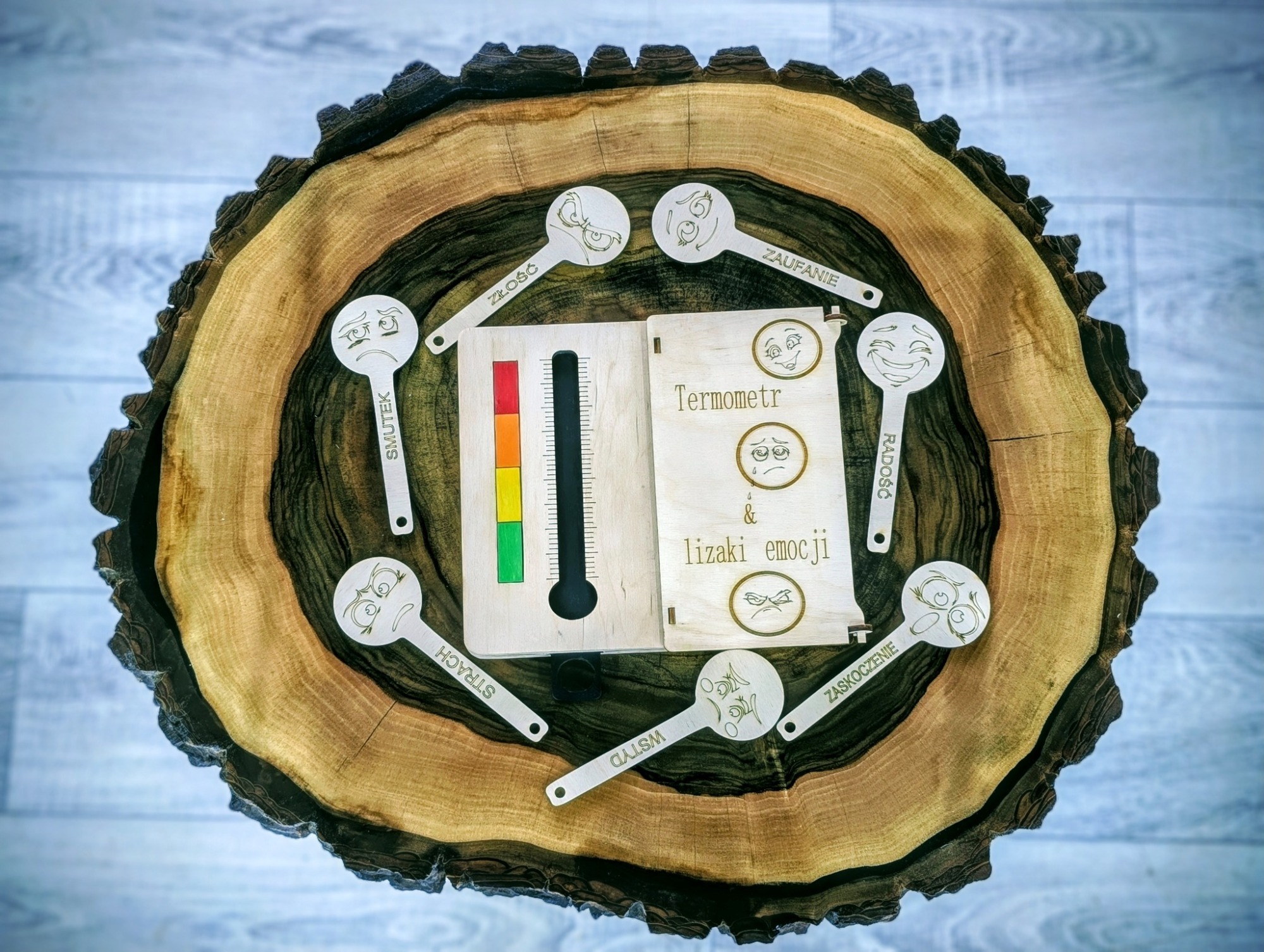W zestawie znajduje się termometr emocji z schowkiem w, którym jest 6 podstawowych emocji.